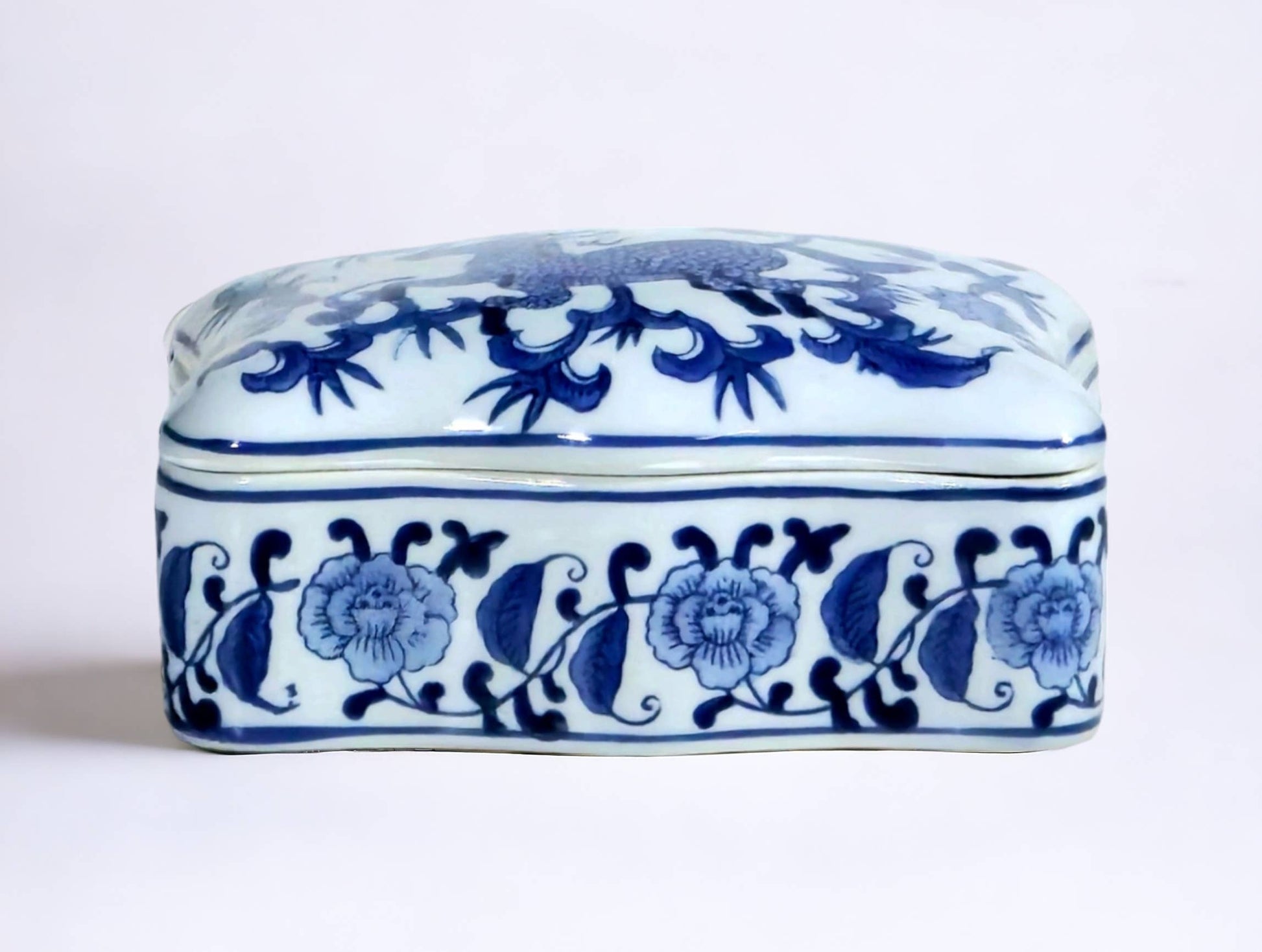 This rectangular porcelain lidded box will bring a touch of class to any room. It boasts a chinoiserie deer and floral design in classic blue with a white background. This is a versatile, multi-functional piece that can be used for storing trinkets or as a standalone decorative piece for your home.